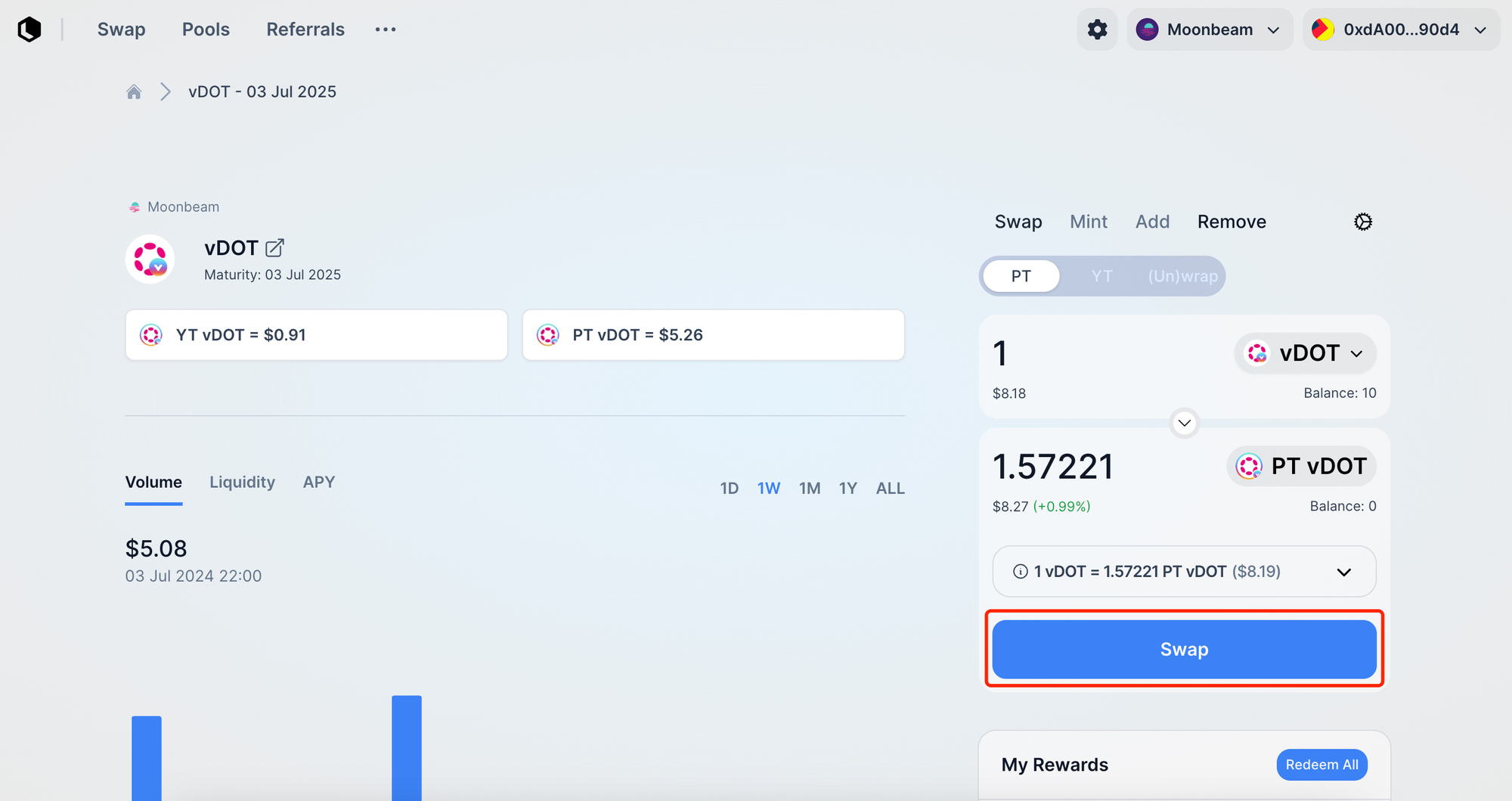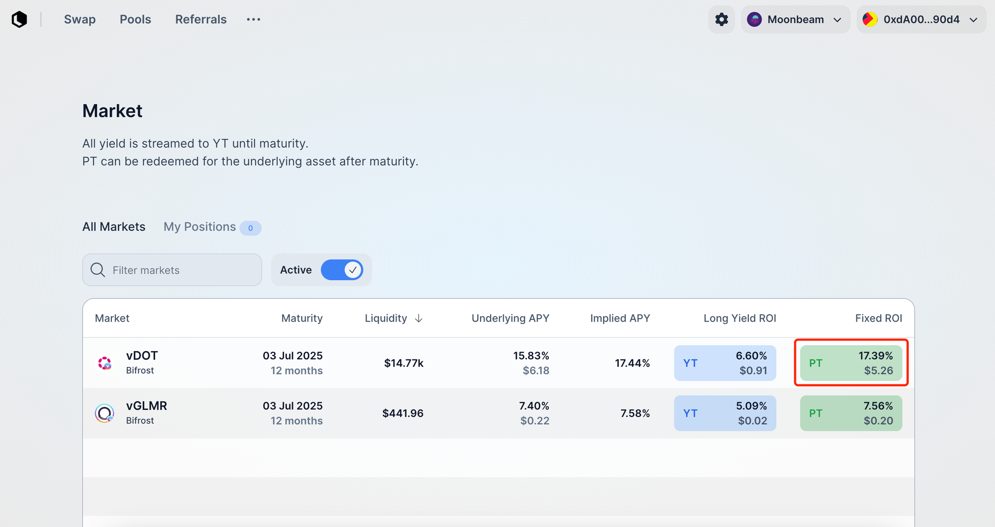 You have now successfully purchased PT and will earn fixed yield (redeemable 1:1 for the underlying asset at maturity, e.g., 1 PT-vDOT = 1 DOT at maturity). To sell PT, perform the reverse operation to swap PT for the underlying yield-bearing asset.