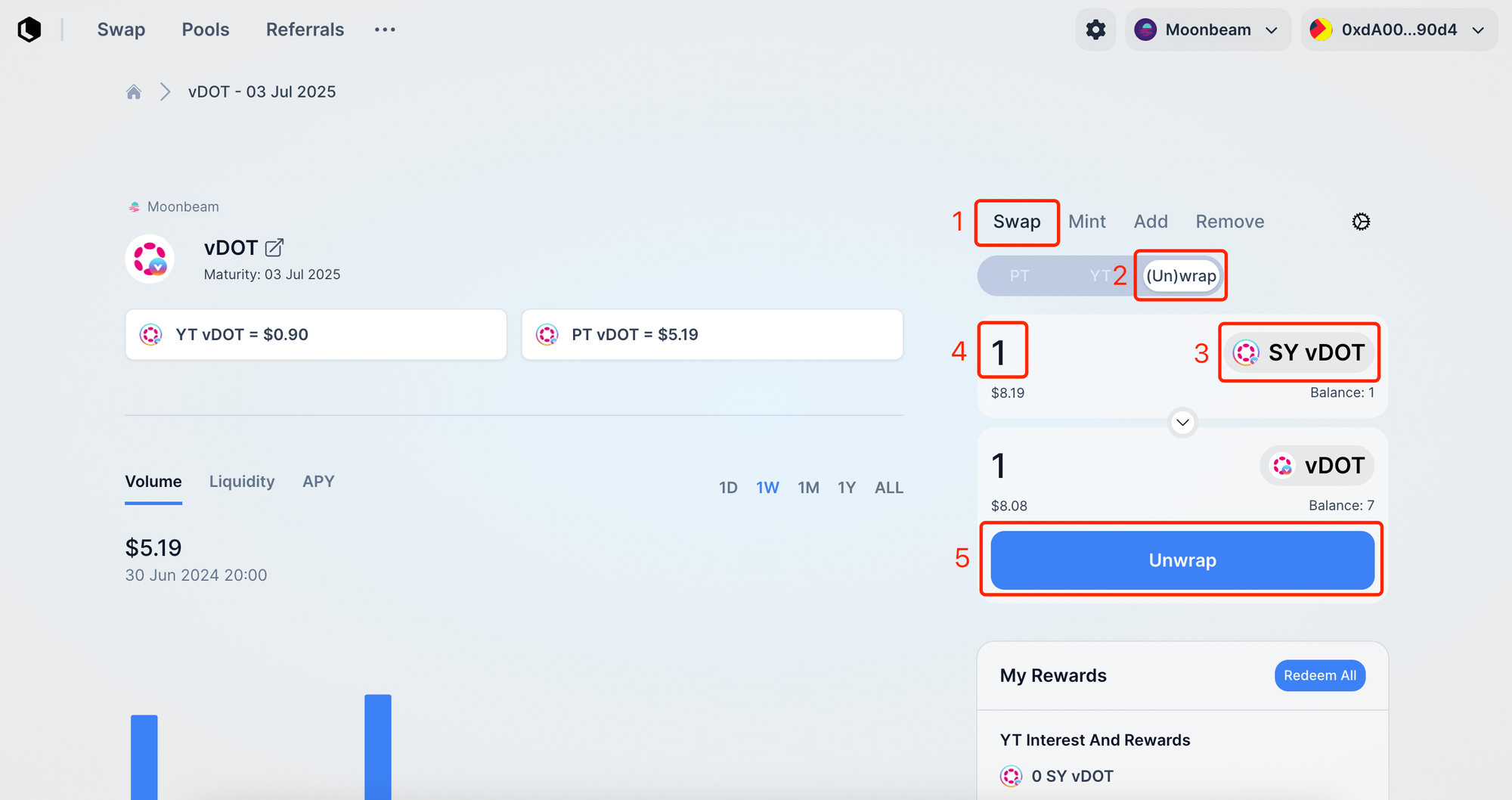 Note: The yield accumulated from holding YT will be distributed in the form of SY. After claiming the yield, you will need to use the (Un)warp function to unwrap it into the underlying yield-bearing asset, e.g., SY-vDOT → vDOT. Refer to the next section for the operation guide.&#x20;